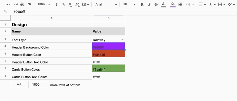 Colors and fonts of your website. To change colors of your website, just as easy to change background color in Google Sheet: