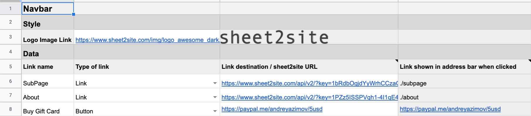 - Link shown in address bar when clicked: This is a preview of how your sheet2site URL will look e.g. yourwebsite.com/subpage.